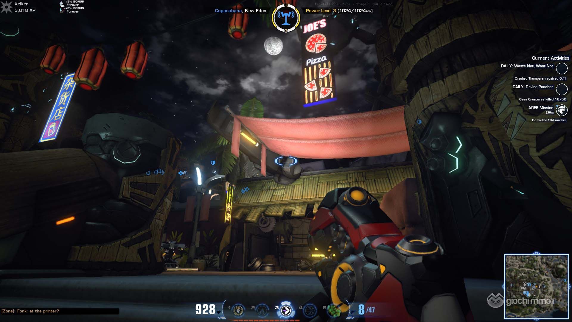 Una volta deciso quale Battleframe utilizzare, è tempo di avventurarsi nel mondo di New Eden, una Terra futuristica in lotta contro l'invasione di una razza aliena: i Chosen. Se siete degli avidi giocatori di MMORPG, la prima cosa che noterete è l'assenza di punti esclamativi luminosi sulla testa degli NPC, il che significa anche che una delle prime domante che vi porrete potrebbe essere "E ora? cosa posso fare? Dove dovrei andare?" La risposta è semplice: al di là di alcune missioni di tutorial basilari, il cui unico scopo è di mostrarvi come raccogliere le risorse e cambiare e potenziare i Battleframe, non ci sono quest in Firefall, o almeno non nel solito modo a cui siete abituati. Firefall offre un open world con caratteristiche sandbox libero dal solito trenino di quest che vi tiene per mano guidandovi attraverso tutti i contenuti offerti dal gioco. Dovrete esplorare il mondo, scoprire nuove zone, cercare sulla mappa eventi dinamici che stanno avvenendo in quel momento e scegliere se parteciparvi o meno. Ci sono diversi tipi di eventi, come invasioni Chosen, missioni ARES, recupero di dati, protezione di raccoglitori di risorse e altro. Questi eventi sono aperti a chiunque e vi ricompenseranno con XP, token (utilizzati per acquistare equipaggiamento) e risorse. Per utilizzare la mappa al fine di visualizzare gli eventi in corso, dovrete prima sbloccare la zona in cui siete raggiungento la torre SIN di quell'area e sincronizzarvi con essa. Le torri SIN sono spesso circondate da un insediamento o una città che può essere catturata dai Chosen durante gli eventi dinamici. I giocatori devono combattere per proteggerle o riconquistarle. Inoltre, le città come Copacabana (la città iniziale) possiedono dei livelli chiamati Power Level, che possono essere aumentati dai giocatori mettendo i Crystite Resonator in uno strumento chiamato Receptacle. Ogni giocatore può contribuire al fine di potenziare la città e sbloccare nuovi mercanti, materiali e bonus per tutti.